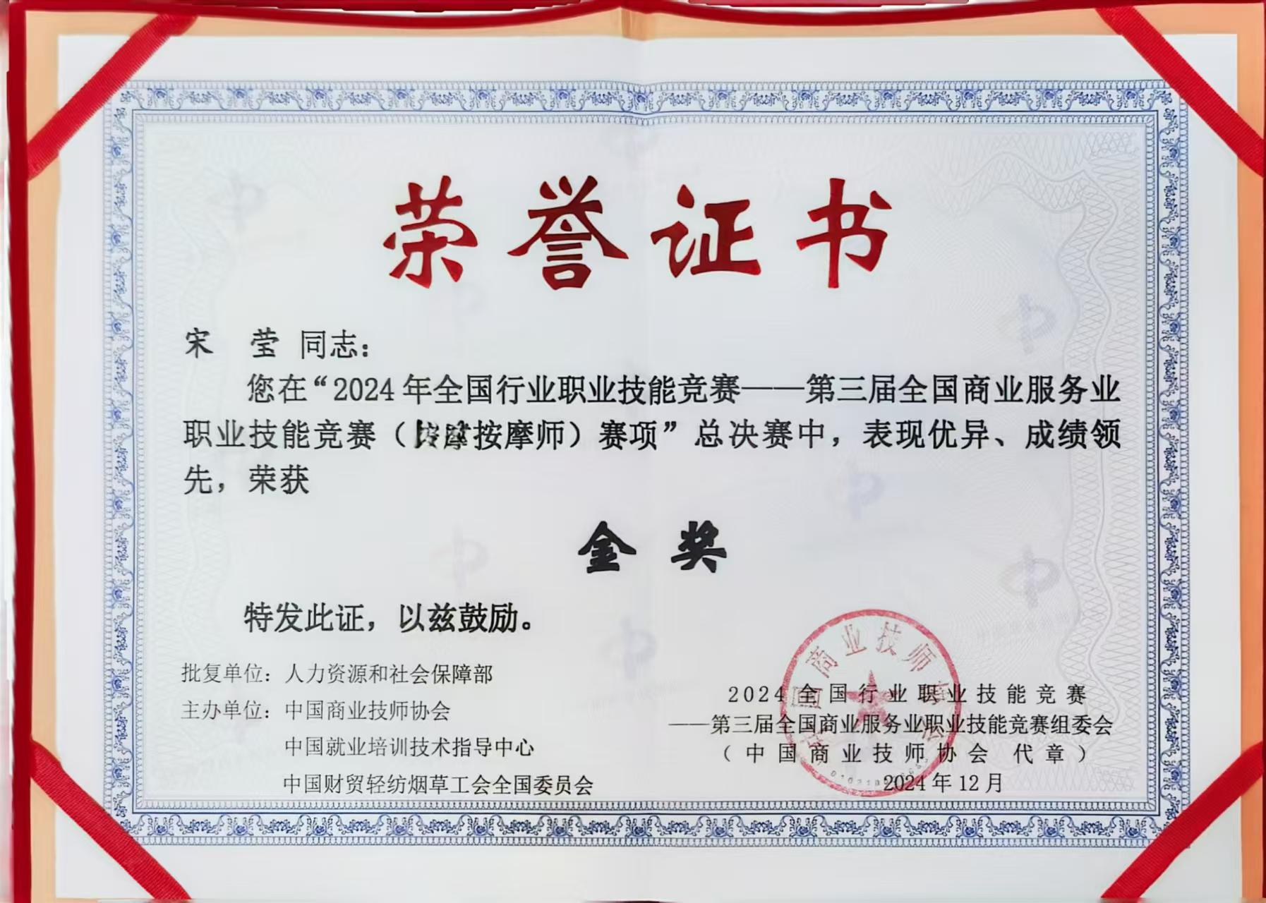 2024年12月8日,推拿一科(朝陽院區(qū))宋瑩主治醫(yī)療按摩師獲得全國行業(yè)職業(yè)技能競賽——第三屆全國商業(yè)服務業(yè)職業(yè)技能競賽按摩類項目總決賽金獎。 這是由人社部批復、中國商業(yè)技師協(xié)會...
